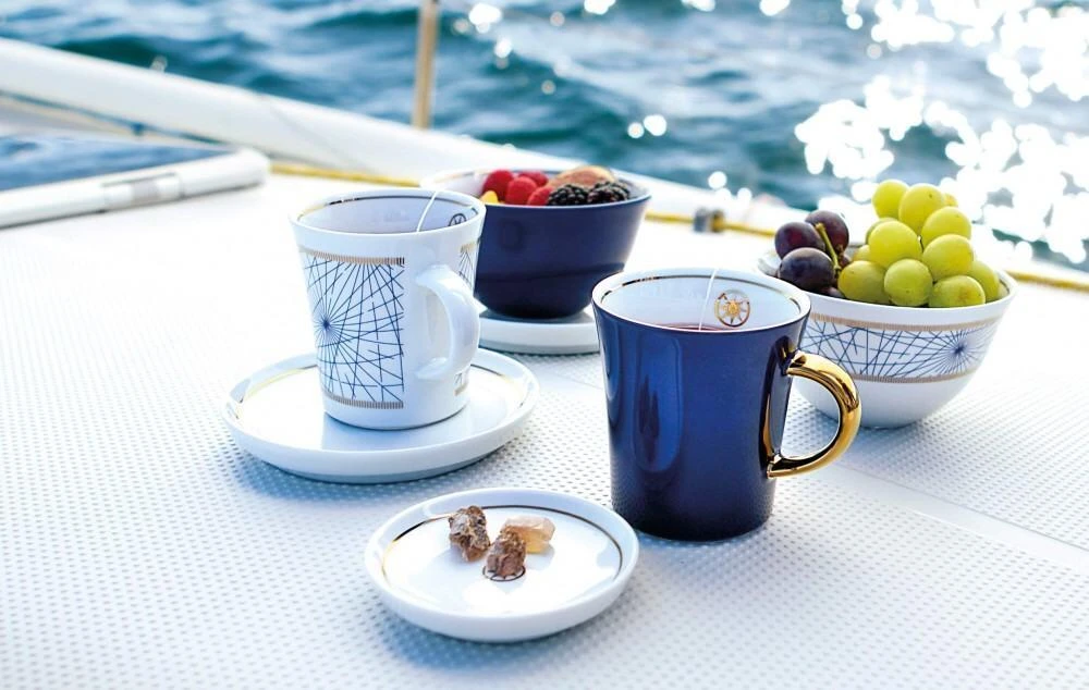 Mit der Geschirrserie „On Tour“ präsentiert Kahla das erste, spezielle Porzellan für die Nutzung auf See. Die multifunktionalen Geschirrteile decken sämtliche wichtige Einsatzmöglichkeiten ab und basieren auf dem Designklassiker Update. Dank der Magic Grip Oberfläche stehen die Teller, Tassen und Schalen sicher an Bord und verliehen dem Geschirr auch bei Wellengang sicheren Halt.