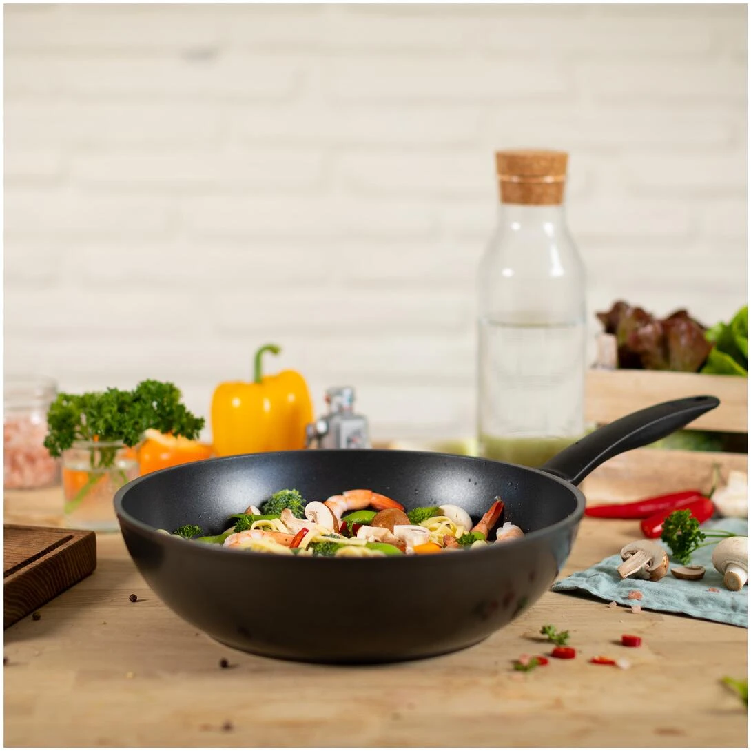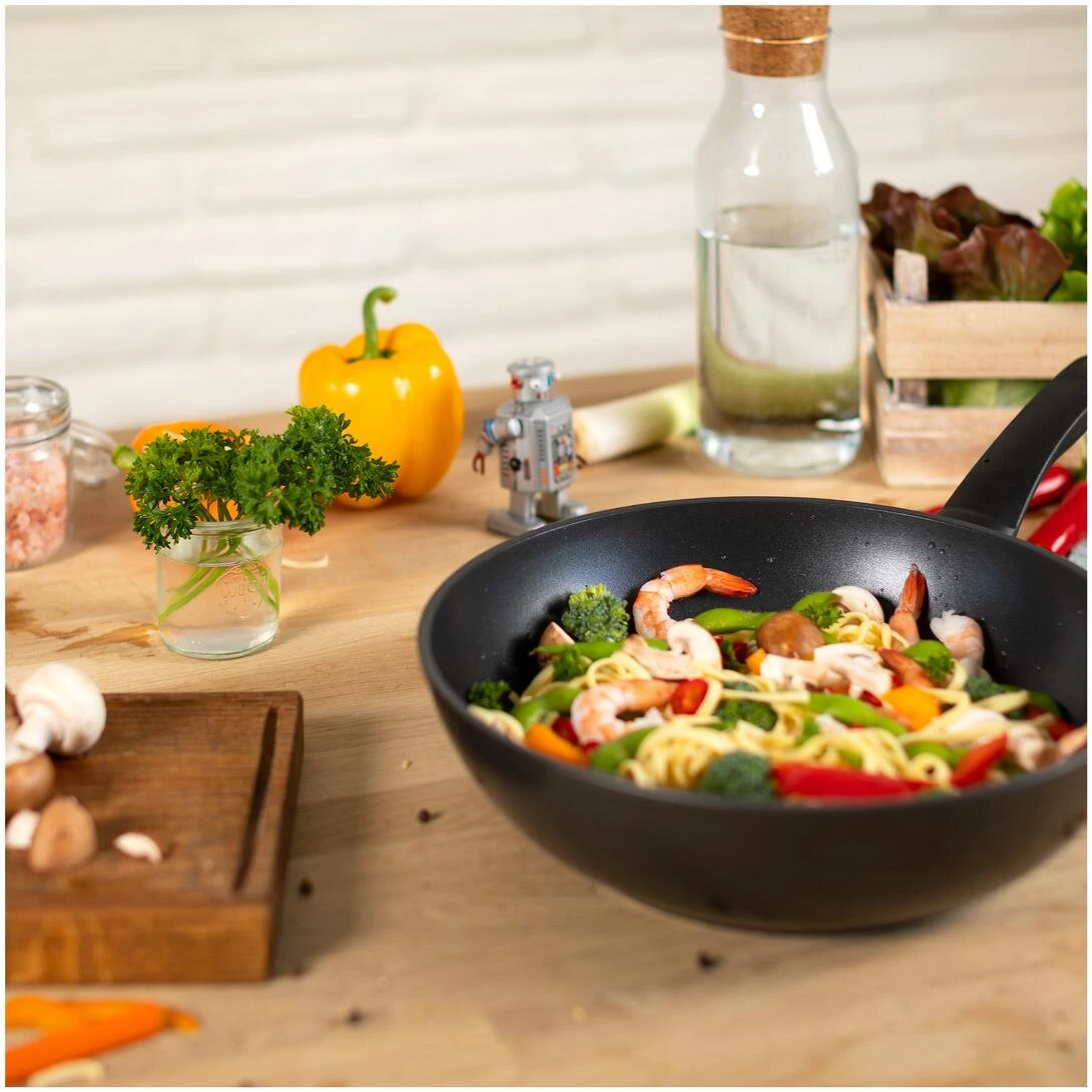 Qualitativ hochwertige, dreilagige Antihaftbeschichtung und leichtes Aluminium machen diesen Wok ideal für den täglichen Gebrauch.