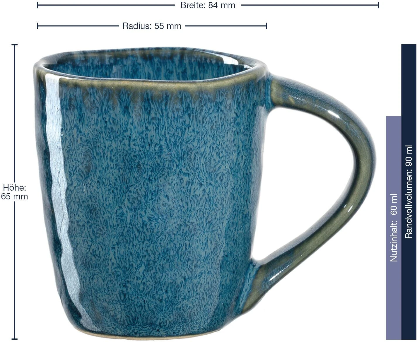 Genuss und Leichtigkeit erleben Sie mit der Tasse aus der Serie MATERA. Lassen Sie sich von dieser Tasse in eine verträumte Welt voller Emotionen entführen – passend zum Landhausstil! Der moderne blaue Farbton betont dabei das sinnliche Design. Mix und Match, die Produkte und Farben sind miteinander kombinierbar. Durch die handaufgetragene Effektglasur ergeben sich einzigartige Farbverläufe und individuelle Muster. Dennoch passen alle Stücke harmonisch zusammen. Das Geschirr ist schnittfest, mikrowellengeeignet und spülmaschinenfest und zudem noch ideal geeignet für schicke Dekorationen. MATERA ist ideal für den gedeckten Tisch – ob morgens, mittags oder abends, ob für Heißgetränke oder die Zubereitung und das Genießen von Speisen. Zögern Sie nicht länger – mit der schönen blauen Espressotasse wird der Alltag zum Genuss!