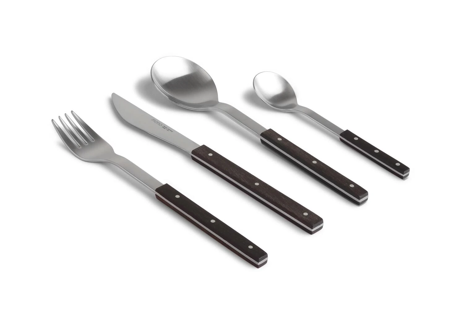 Anfang der 60er wurde die Mono A Serie durch Mono T (Teakholz) und Mono E (Ebenholz) ergänzt. Die Besteckgriffe von Mono E und Mono T werden beiseitig mit dem aufgenieteten, edlen Holz (nicht spülmaschinengeeignet!) verblendet und ergeben einen reizvollen Kontrast zum Edelstahl