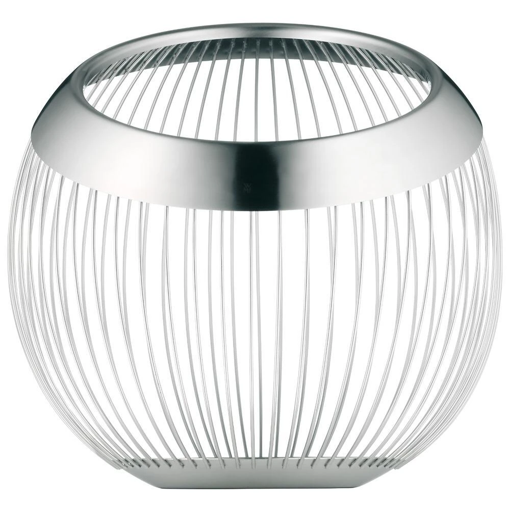 WMF Korb Lounge, groß. Die filigranen Drahtgeflechte wirken mit und ohne Inhalt als Blickfang. Der breite Edelstahlrand und die gebogenen Drähte bilden einen spannungsvollen Kontrast. Nur erstklassiges Material und sorgfältige Verarbeitung sorgen für Formbeständigkeit. Durch die nach vorne gebeugte Form ist ein leichtes Entnehmen möglich und dadurch ideal für Obst und Zitrusfrüchte geeignet.