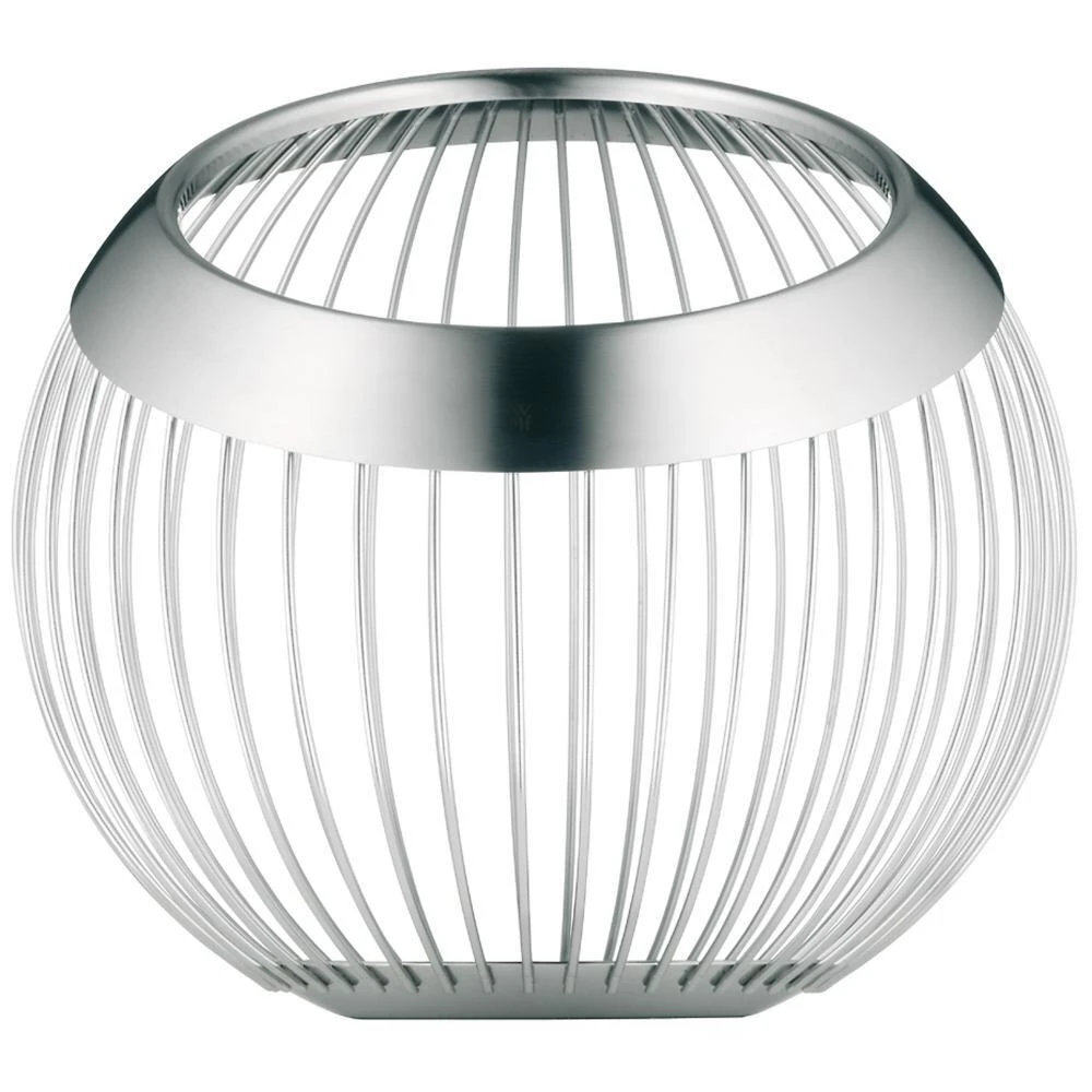 WMF Korb Lounge, klein. Die filigranen Drahtgeflechte wirken mit und ohne Inhalt als Blickfang. Der breite Edelstahlrand und die gebogenen Drähte bilden einen spannungsvollen Kontrast. Nur erstklassiges Material und sorgfältige Verarbeitung sorgen für Formbeständigkeit. Durch die nach vorne gebeugte Form ist ein leichtes Entnehmen möglich und dadurch ideal für Obst und Zitrusfrüchte geeignet.